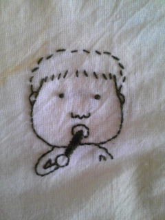 その状況をお出かけ用のご飯入れ袋に刺繍してみた。