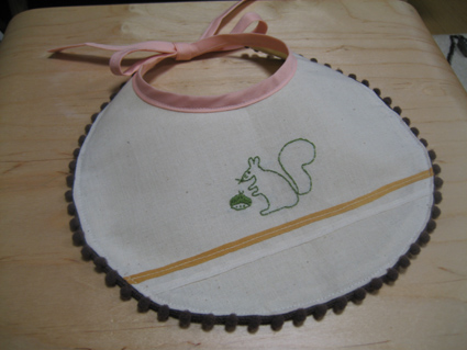 おともだちのイラストレーターさのまきこちゃんのかわいいリスのイラストをお願いしてお借りしてスタイを作りました。まきこちゃんありがとう。まきこちゃんの絵ってばほんとにかわいくて刺繍しながら大興奮!周りをもけもけが覆っています。