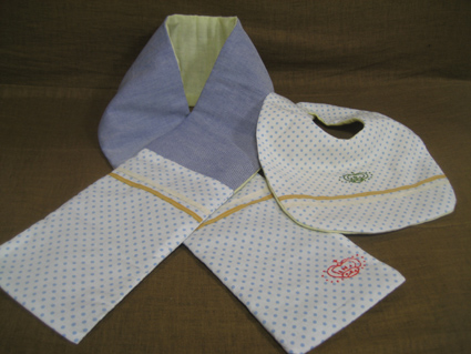 実はおねえちゃんも最近第2子を出産!おねえちゃんへの出産祝いで、2人の息子のために作りました。もうすぐ3歳のお兄ちゃんはスタイをもう使わないそうなので春用マフラー。弟はスタイ。