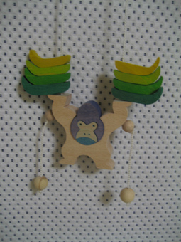 ひもを左右交互に引っ張るとバナナと共に上にのぼって行くんです。