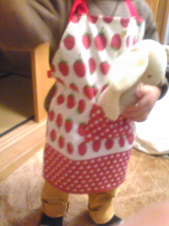 おやつ作りの時はいちごのエプロン。